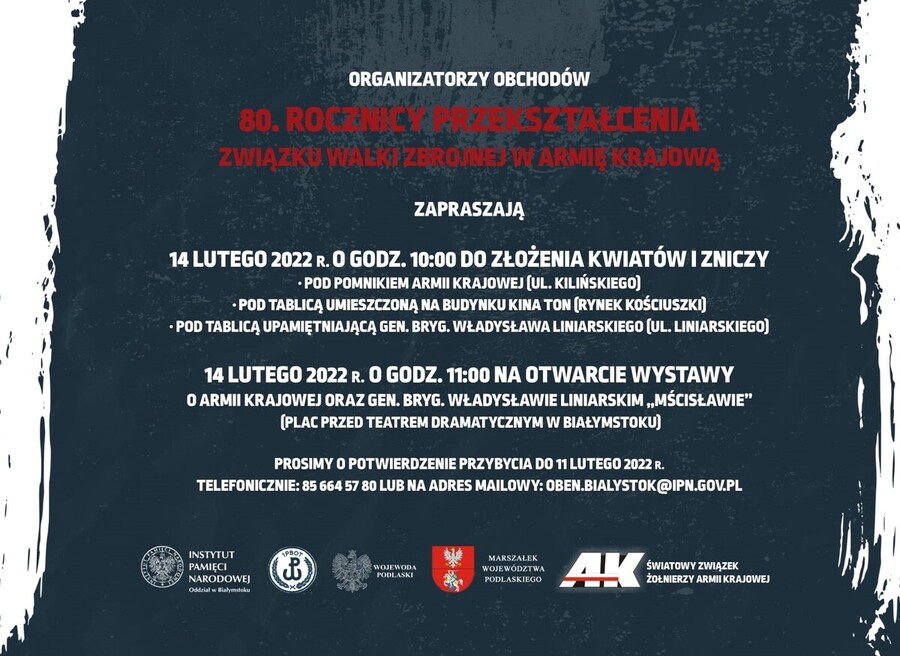 Dyrektor Oddziału IPN w Białymstoku dr hab. Piotr Kardela, dowódca 1. Podlaskiej Brygady Wojsk Obrony Terytorialnej płk Sławomir Kocanowski, Wojewoda Podlaski Bohdan Paszkowski, Marszałek Województwa Podlaskiego Artur Kosicki i Prezes Światowego Związku Żołnierzy Armii Krajowej Okręg Białystok mjr Czesław Chociej pragną zaprosić na obchody 80. rocznicy przemianowania Związku Walki Zbrojnej na Armię Krajową.
