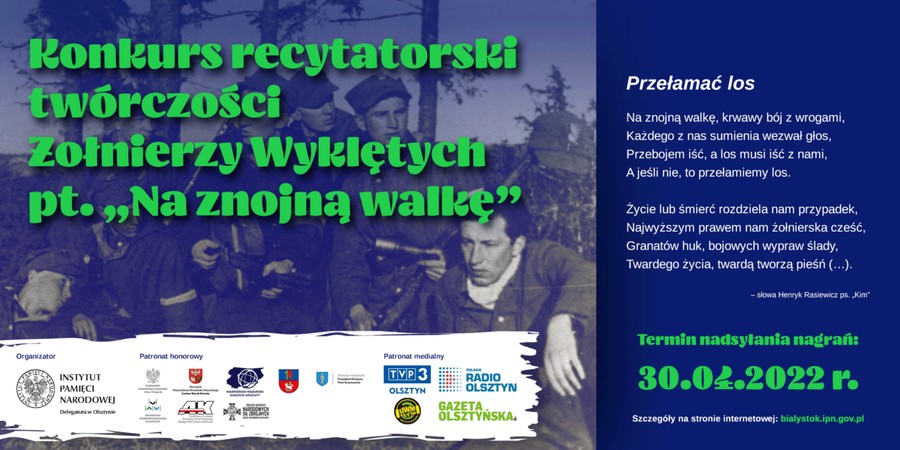 Serdecznie zapraszamy do udziału w konkursie recytatorskim twórczości Żołnierzy Wyklętych pt. „Na znojną walkę”, który jest organizowany przez Delegaturę IPN w Olsztynie. Celem konkursu jest m.in. zapoznanie uczestników z losem żołnierzy polskiego powojennego podziemia niepodległościowego i antykomunistycznego, którzy stawiali opór sowietyzacji Polski i podporządkowaniu jej ZSRS.