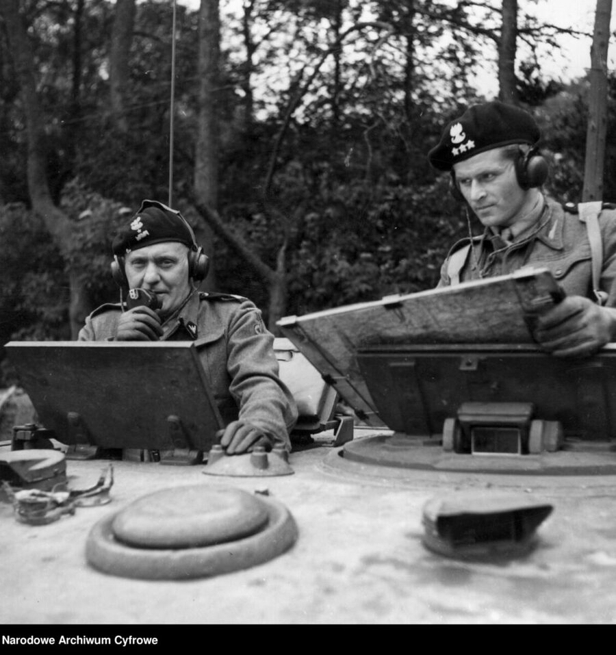 1 Dywizja Pancerna – ćwiczenia, osoby widoczne na zdjęciu: gen. Stanisław Maczek, rotmistrz Tadeusz Wysocki (źródło: domena publiczna Narodowego Archiwum Cyfrowego)