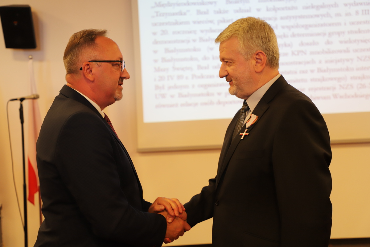 Dużą grupę odznaczonych stanowili członkowie nielegalnego wówczas Niezależnego Zrzeszenia Studentów na Filii Uniwersytetu Warszawskiego w Białymstoku. Do nich również zwrócił się dr. hab. Karol Polejowski:
