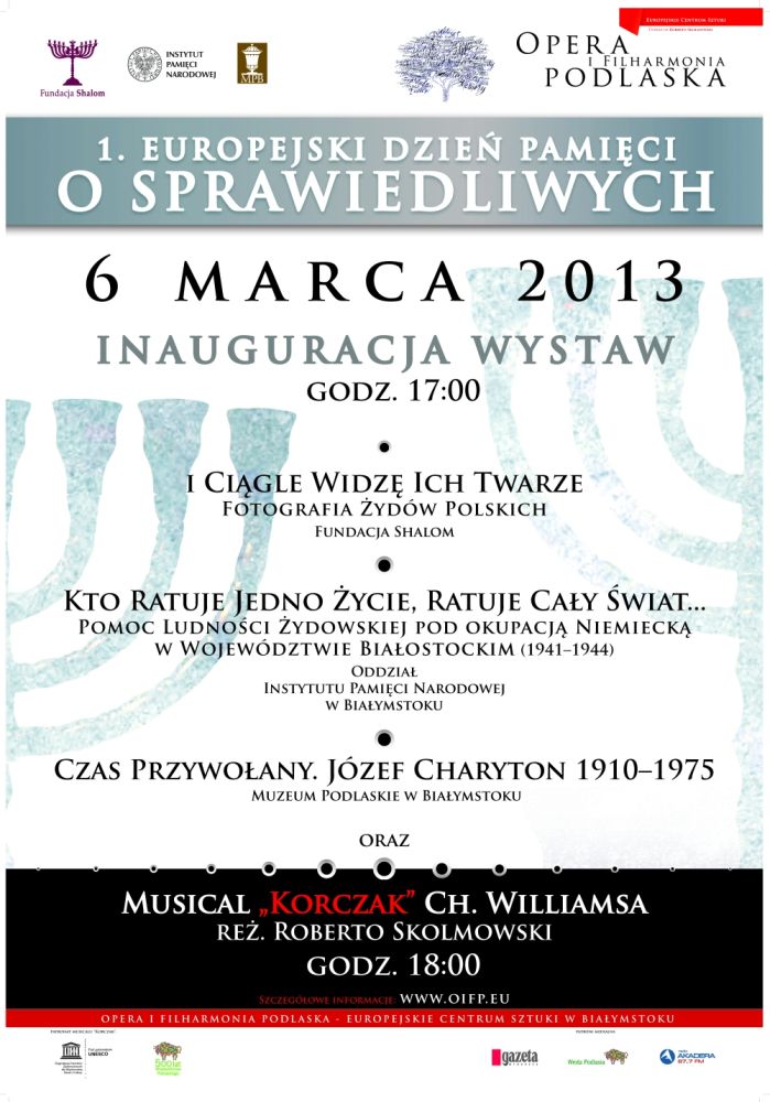 W dniu 6 marca 2013 r. w Operze i Filharmonii Białostockiej, w ramach obchodów 1. Europejskiego Dnia Pamięci o Sprawiedliwych, odbyło się uroczyste otwarcie trzech wystaw poświęconych Zagładzie. Wśród nich znalazła się wystawa „Kto ratuje jedno życie, ratuje cały świat… Pomoc ludności żydowskiej pod okupacją niemiecką w latach 1941–1944” autorstwa dr Ewy Rogalewskiej z Oddziałowego Biuro Edukacji Publicznej IPN w Białymstoku. Dwie pozostałe wystawy to słynna ekspozycja „I ciągle widzę ich twarze. Fotografie Żydów polskich” oraz „Czas przywołany. Józef Charyton 1910–1975”, prezentująca portrety Żydów z Kresów. Gościem specjalnym wernisażu była Pani Katarzyna Meloch, ocalała z białostockiego getta, której losy zostały opisane na wystawie IPN.