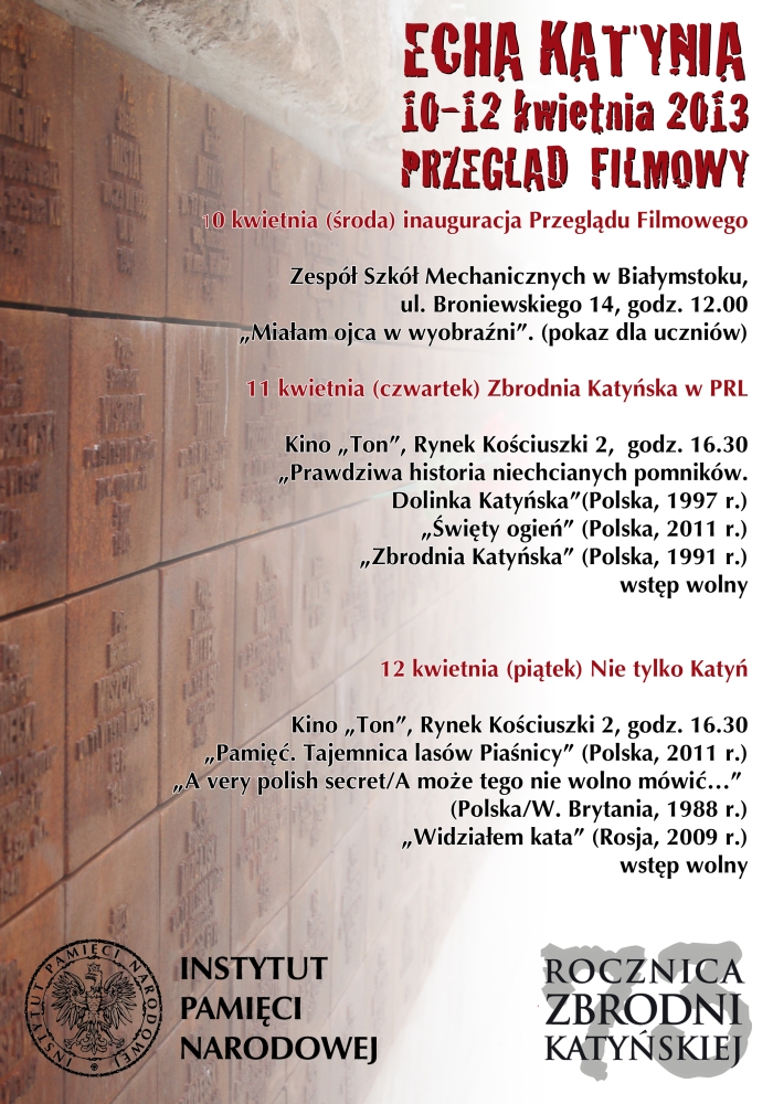 W dniach 10–12 kwietnia 2013 r., z okazji 73. rocznicy Zbrodni Katyńskiej, Oddział Instytutu Pamięci Narodowej w Białymstoku włączył się w organizację ogólnopolskiego przeglądu filmowego „Echa Katynia”, w ramach którego zostanie wyświetlonych siedem filmów dokumentalnych związanych ze Zbrodnią Katyńską i pamięcią o zbrodniach wojennych w powojennej Polsce. W środę uczniowie Zespołu Szkół Mechanicznych w Białymstoku obejrzeli film „Miałam ojca w wyobraźni”, zrealizowany w 2012 r. w białostockim oddziale IPN przez Tomasza Piotrowskiego. W czwartkowych projekcjach w kinie „Ton” uczestniczyło ponad czterdzieści osób, które obejrzały m.in. film dokumentalny „Święty ogień” o Walentym Badylaku, żołnierzu AK, który w 1980 r. dokonał w Krakowie samospalenia w proteście przeciwko zakłamywaniu prawdy o Zbrodni Katyńskiej. Na piątek przewidziana jest m.in. projekcja pierwszego filmu dokumentalnego o Obławie Augustowskiej pt. „A może tego nie wolno mówić…” z 1988 r. w reżyserii Jacka Petryckiego. W tym roku, po raz pierwszy, przegląd odbywa się poza Warszawą: w Białymstoku Rzeszowie, Lublinie, Szczecinie, Gdyni, Krakowie, Tarnowie i we Wrocławiu.