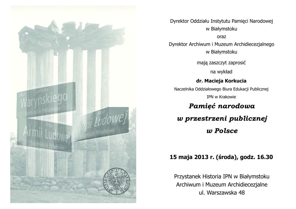 15 maja 2013 r. na białostockim Przystanku Historia gościł dr Maciej Korkuć, naczelnik Oddziałowego Biura Edukacji Publicznej IPN w Krakowie, który wygłosił wykład pt. „Pamięć narodowa w przestrzeni publicznej”. W wystąpieniu zawarł m.in. przykłady dbałości o pamięć historyczną w takich państwach jak Niemcy, Rosja czy Izrael. Przedstawił także kwestię manipulacji pamięcią, jaką ciągle możemy obserwować w przestrzeni publicznej naszego kraju, na tablicach, pomnikach, w miejscach pamięci. Po wykładzie wywiązała się burzliwa dyskusja o potrzebie dekomunizacji przestrzeni publicznej Białegostoku.