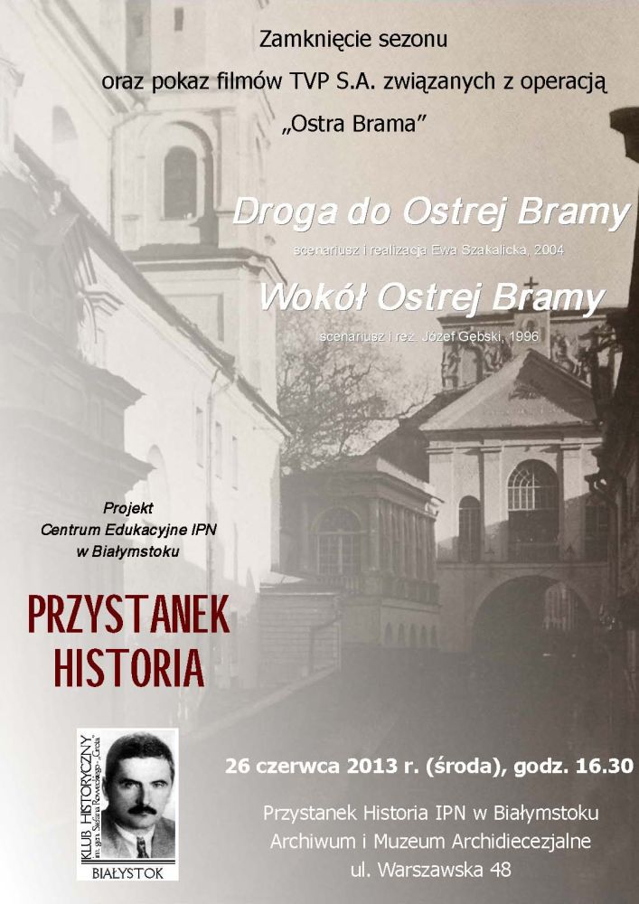 26 czerwca 2013 r. o godz. 16.30 na białostockim „Przystanku Historia” (siedziba Archiwum i Muzeum Archidiecezjalnego, ul. Warszawska 48) odbędzie się pokaz filmów dokumentalnych związanych z operacją „Ostra Brama”. Pokaz zakończy pierwszy sezon działalności „Przystanku”.