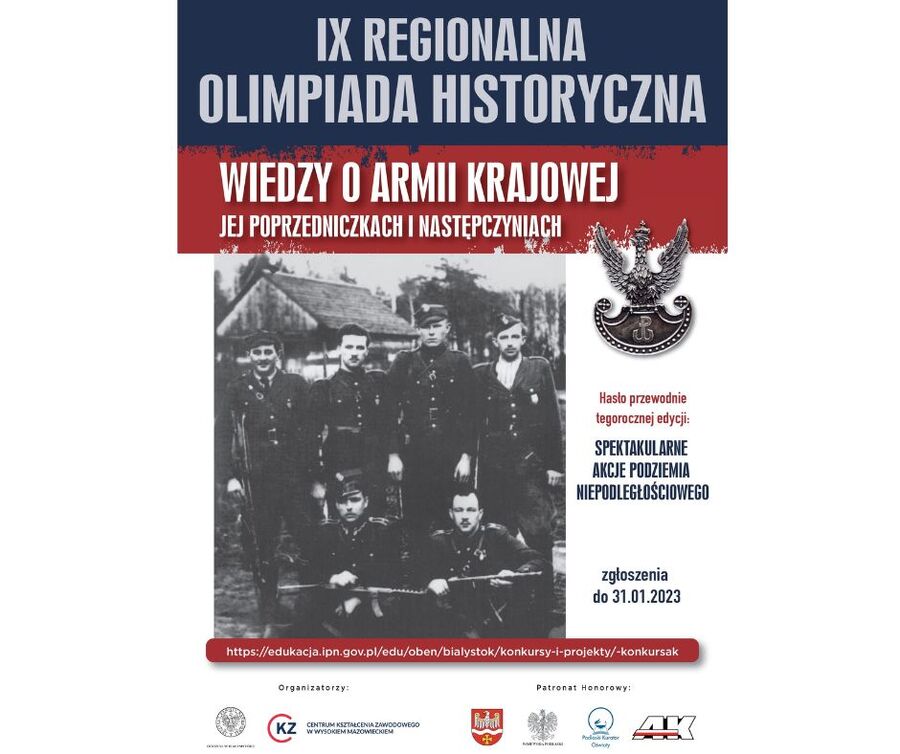Dokumentacja konkursowa (regulamin, formularz zgłoszeniowy, oświadczenie, literatura pomocnicza) jest dostępna w załącznikach na dole strony oraz na stronach Centrum Kształcenia Zawodowego w Wysokiem Mazowieckiem. Honorowy patronat nad konkursem sprawują: Prezes Zarządu Głównego Światowego Związku Żołnierzy Armii Krajowej, Podlaski Kurator Oświaty, Wojewoda Podlaski i Starosta Wysokomazowiecki.