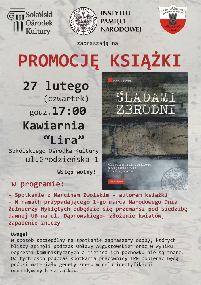 27 lutego 2014 r. Sokólskim Ośrodku Kultury w Sokółce odbyła się promocja najnowszej książki dr. Marcina Zwolskiego z IPN w Białymstoku pt. „Śladami zbrodni okresu stalinowskiego w województwie białostockim".