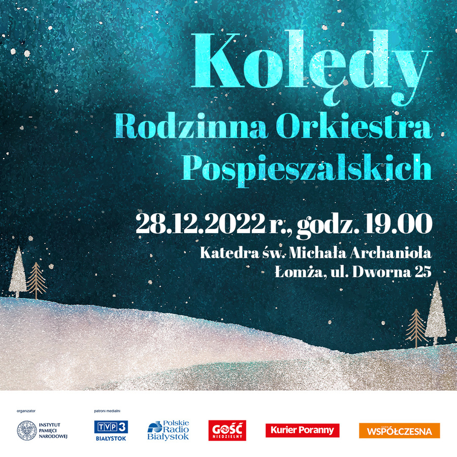 Rodzinne kolędowanie to tradycja, która gości w wielu polskich domach. Czasem się o niej zapomina, choć słowa kolęd tlą się w naszych sercach, ale gdy zabrzmi „Bóg się rodzi”, wielu tęsknie powraca myślami do wspólnych śpiewów… Będzie ku temu okazja już niedługo! Instytut Pamięci Narodowej zaprasza na koncert Rodzinnej Orkiestry Pospieszalscy 28 grudnia 2022 roku o godz. 19.00 w katedrze św. Michała Archanioła w Łomży.