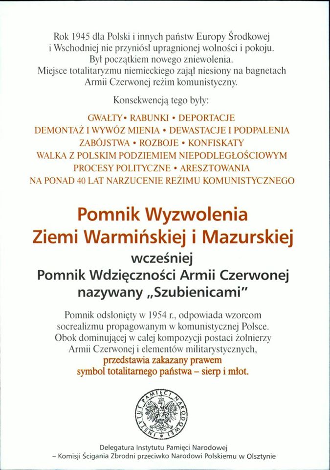 Od 8 maja 2015 r. Delegatura IPN w Olsztynie rozpoczyna akcję informacyjną dotyczącą pomnika Wyzwolenia Ziemi Warmińskiej i Mazurskiej (wcześniej pomnika Wdzięczności Armii Czerwonej), potocznie nazywanego „Szubienicami”, w kontekście rocznicy zakończenia wojny w Europie. Pracownicy IPN przez kilka dni będą rozdawać ulotki informujące o jego historii i zakazanej prawem symbolice (sierpa i młota).