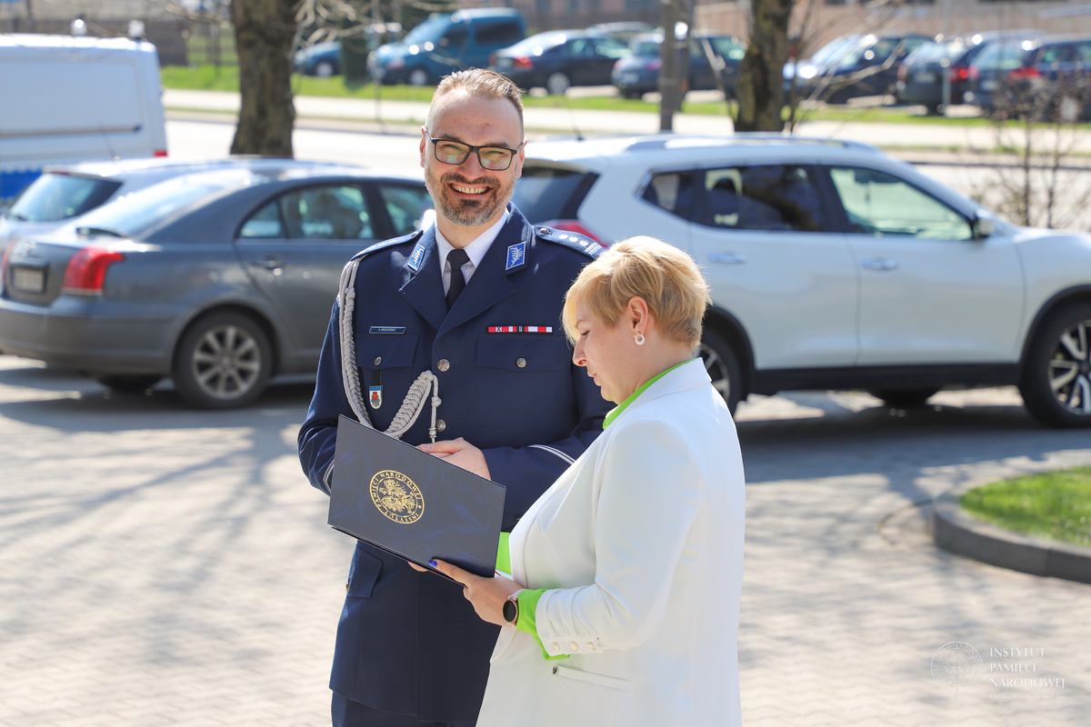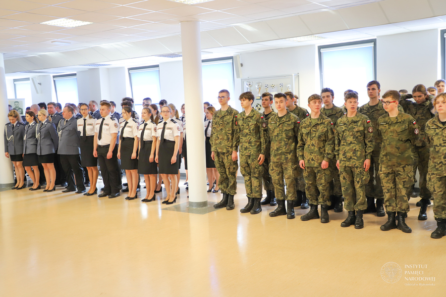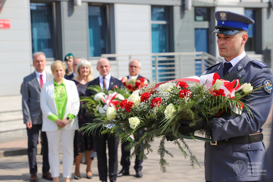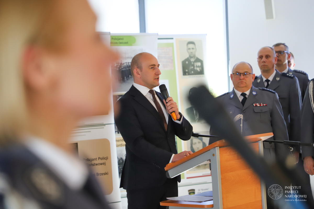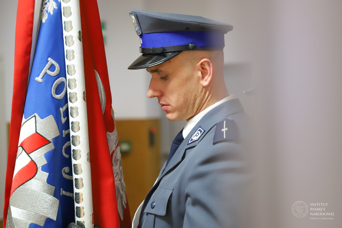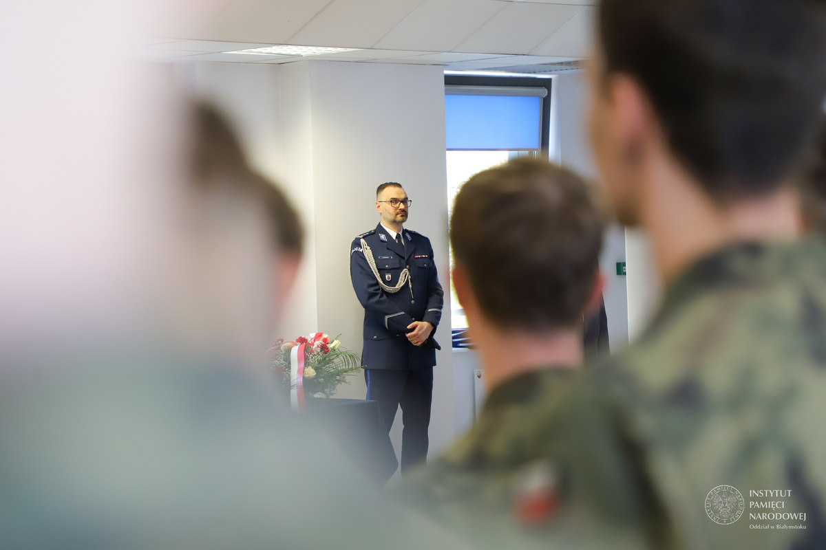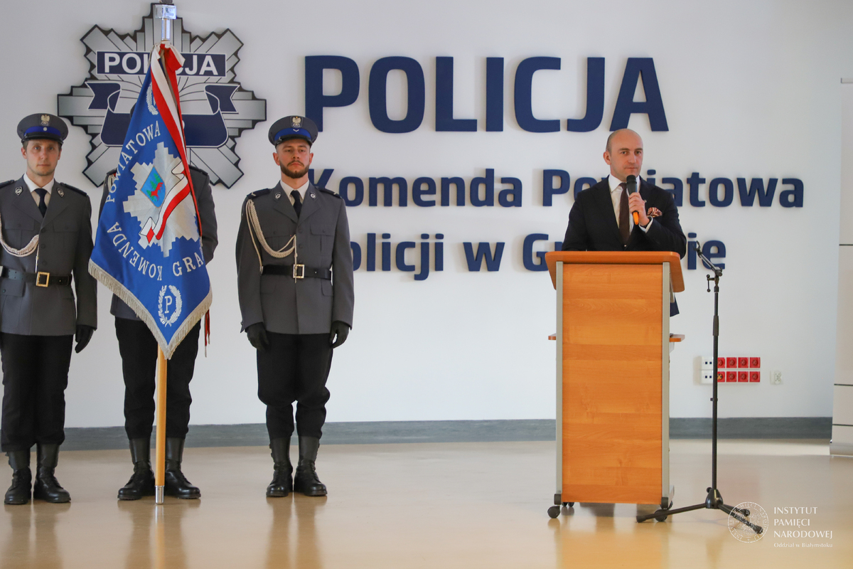 Po złożeniu meldunku komendantowi powiatowemu, wprowadzeniu sztandaru Policji, powitaniu gości przez komendanta insp. Adama Brodowskiego - głos zabrał dyrektor Oddziału Instytutu Pamięci Narodowej w Białymstoku dr Marek Jedynak.
