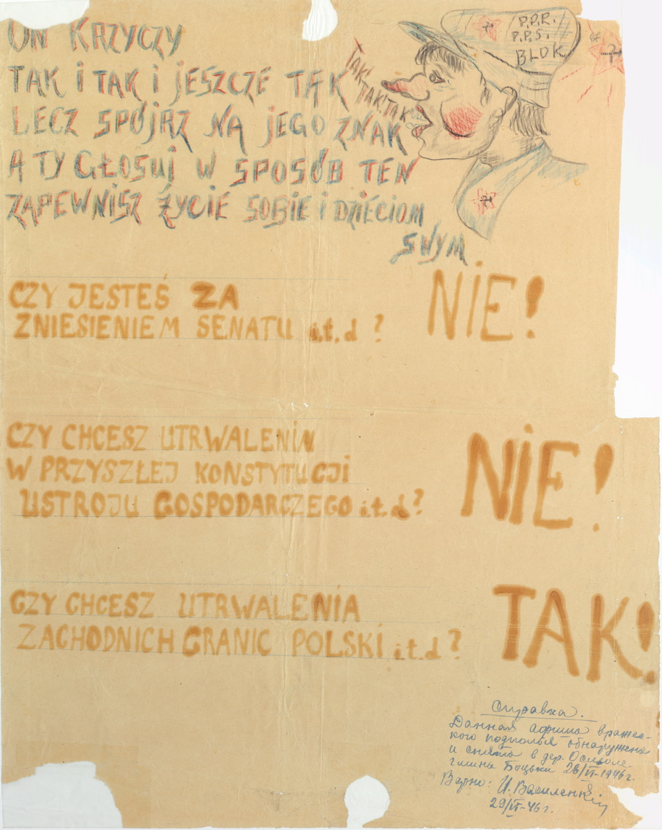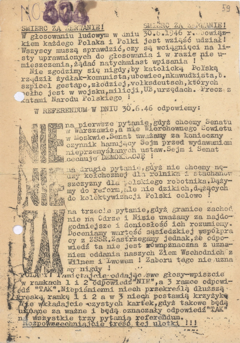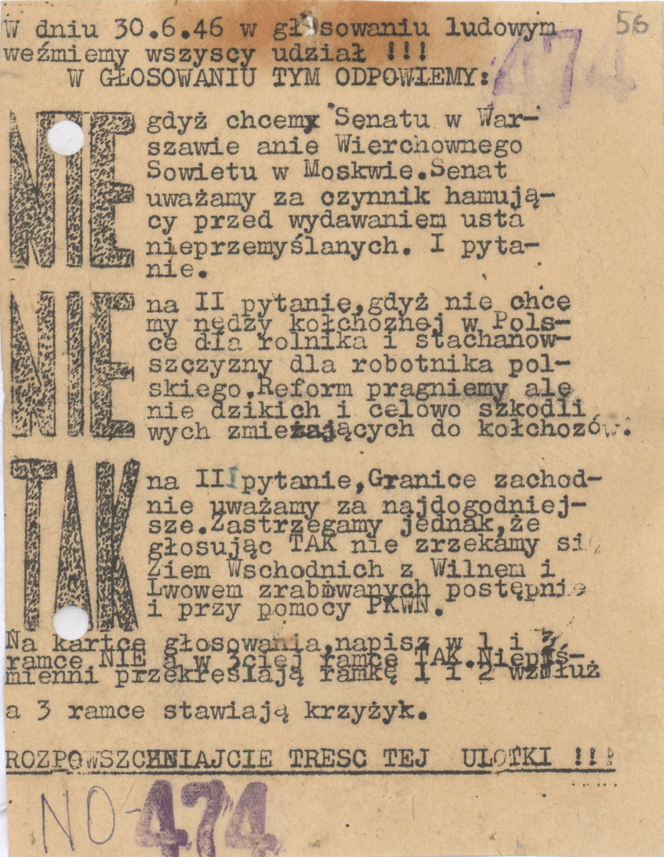 30 czerwca 1946 roku odbyło się w Polsce referendum ludowe w pełni kontrolowane i sfałszowane przez władzę komunistyczną. Ideą przyświecającą przeprowadzeniu referendum było uzyskanie czasu, w którym nowa władza mogła bez większych problemów przejąć pełną kontrolę nad krajem. Był to swoisty test przed przeprowadzeniem wyborów do Sejmu, które miały się odbyć 19 stycznia 1947 roku.