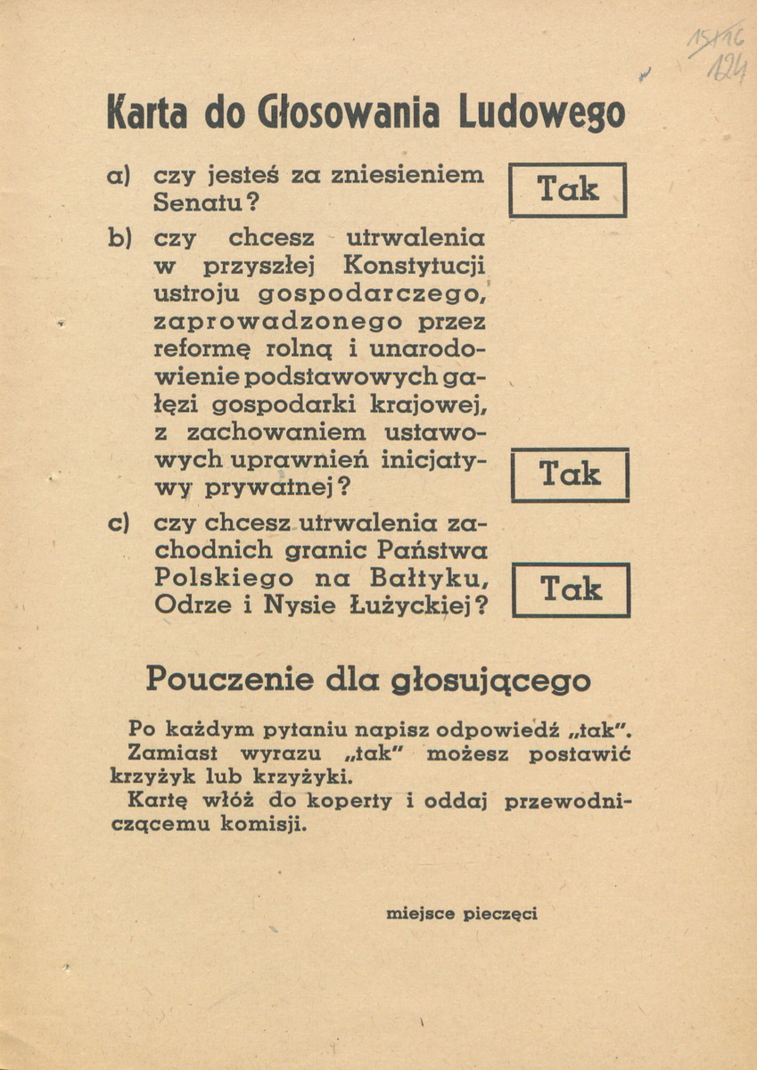 W dniu 27 kwietnia 1946 r. Krajowa Rada Narodowa uchwaliła ustawę o głosowaniu ludowym, w którym postawiono trzy pytania: