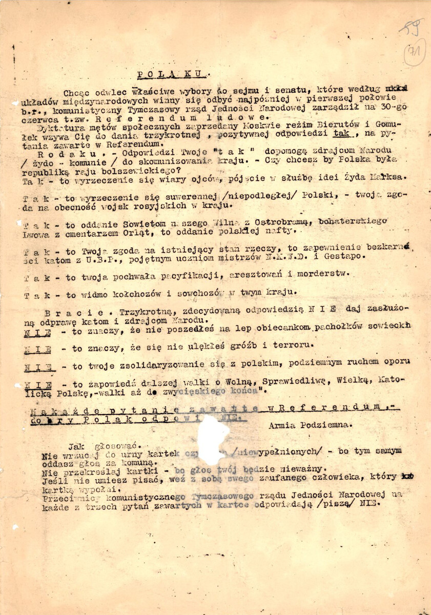 W zasobie archiwalnym Oddziałowego Archiwum IPN w Białymstoku można odnaleźć ciekawe materiały przedstawiające przebieg kampanii propagandowej ze strony władzy ludowej, jak i podziemia niepodległościowego. Pokazują one jakie środki finansowe i ludzkie angażowały obie strony. Władza ludowa posiadając w swoich rękach budżet państwa i pomoc ZSRS tworzyły kolorowe ulotki, plakaty i afisze. Natomiast podziemie niepodległościowe dysponujące znacznie mniejszymi zasobami nie było w stanie konkurować z propagandą komunistyczną. Przebieg i prawdziwe, a nie „oficjalne”, wyniki referendum uświadomiły władzy ludowej, że tyko zintensyfikowanie propagandy oraz wzmocnienie aparatu bezpieczeństwa umożliwi przejęcie pełnych rządów w Polsce.