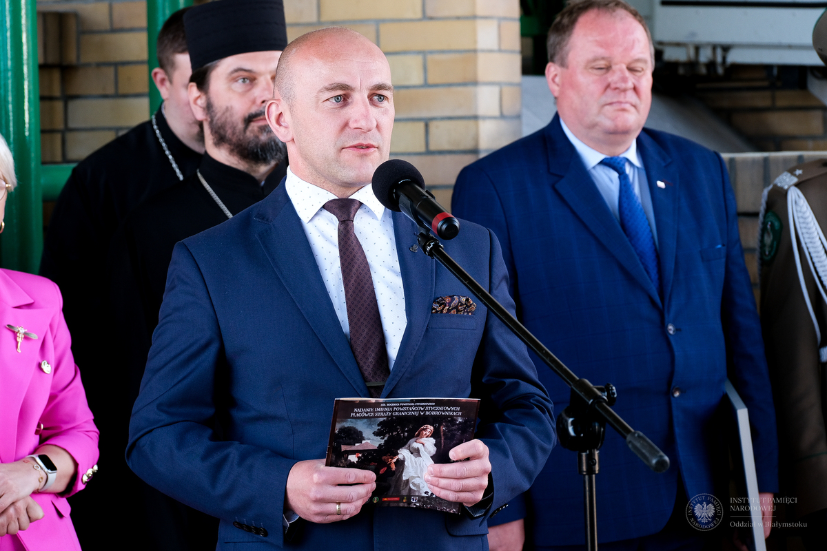 160. rocznica wybuchu Powstania Styczniowego to moment, który możemy zapamiętać jako kolejne ogniwo wydarzeń w łańcuchu pokoleń. Reprezentuję Oddział Instytutu Pamięci Narodowej w Białymstoku, czuję się bardzo zobowiązany i wyróżniony, że mogliśmy się włączyć w przygotowanie tych obchodów, projektowanie tablicy pamiątkowej, stworzeniem kolejnej całostki filatelistycznej w ramach serii "Największe bitwy i potyczki zrywu niepodległościowego z 1863 r. na terenie województwa podlaskiego", która będzie trwałą pamiątką tego wydarzenia. Ciekawy walor, który ukazuje tym razem obraz pt. „Patrol powstańczy" autorstwa Maksymiliana Gierymskiego. Jest to pośrednie nawiązanie do patroli Służby Granicznej (...). To właśnie Państwo, funkcjonariusze Straży Granicznej, stoją na straży niepodległości naszego kraju - mówił dyrektor Oddziału Instytutu Pamięci Narodowej w Białymstoku dr Marek Jedynak.