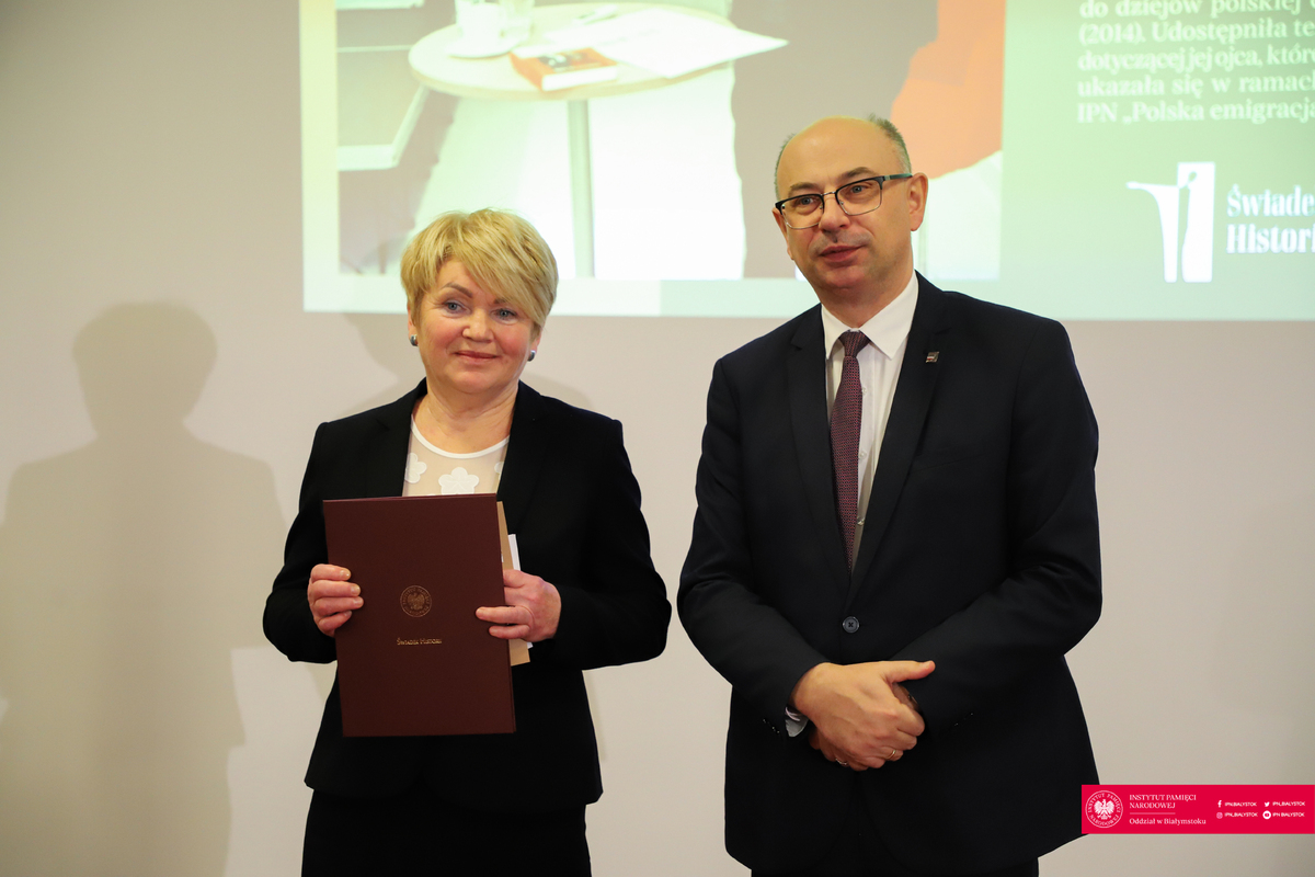 8 grudnia 2023 r. w siedzibie Oddziału Instytutu Pamięci Narodowej w Białymstoku odbyła się uroczystość wręczenia Nagrody Honorowej IPN „Świadek Historii”. Zasłużonym dla upamiętniania historii narodu polskiego oraz wspierającym od lat działania IPN nagrody wręczył dr Mateusz Szpytma, zastępca prezesa Instytutu Pamięci Narodowej.