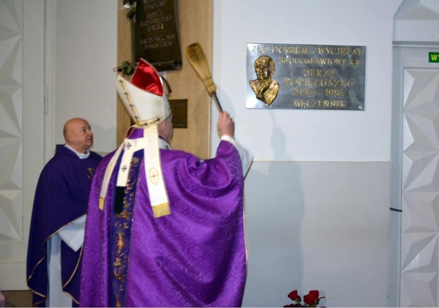 Uroczystemu nabożeństwu przewodniczył abp Józef Guzdek, który dokonał poświęcenia odsłoniętej tablicy upamiętniającej kapelana warszawskiej „Solidarności” bł. ks. Jerzego Popiełuszkę.
