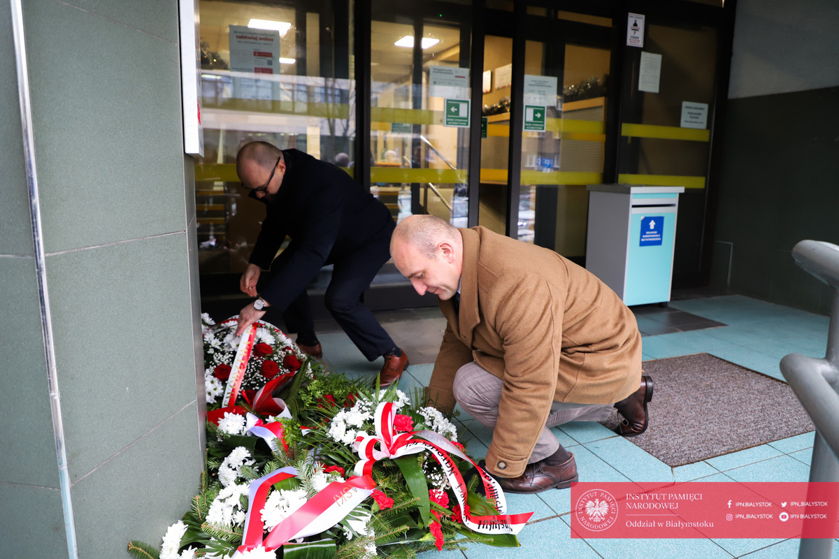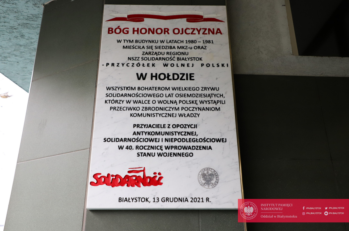 Następnie dalsza część obchodów miała miejsce przed tablicą upamiętniającą działaczy NSZZ „Solidarność”, gdzie uczestnicy oddali również hołd białostockiej „Solidarności”. Tablica pamiątkowa znajduje się na budynku I Urzędu Skarbowego przy ul. Świętojańskiej, gdzie w latach 1980-1981 mieściła się siedziba zarządu regionu tego związku. Tablica powstała staraniem Oddziału Instytutu Pamięci Narodowej w Białymstoku oraz NSZZ „Solidarność” Region Podlaski, z inicjatywy dawnych opozycjonistów niepodległościowych, skupionych w Klubie Więzionych, Internowanych i Represjonowanych (WIR) i została uroczyście odsłonięta oraz poświęcona w 40. rocznicę wprowadzenia stanu wojennego.