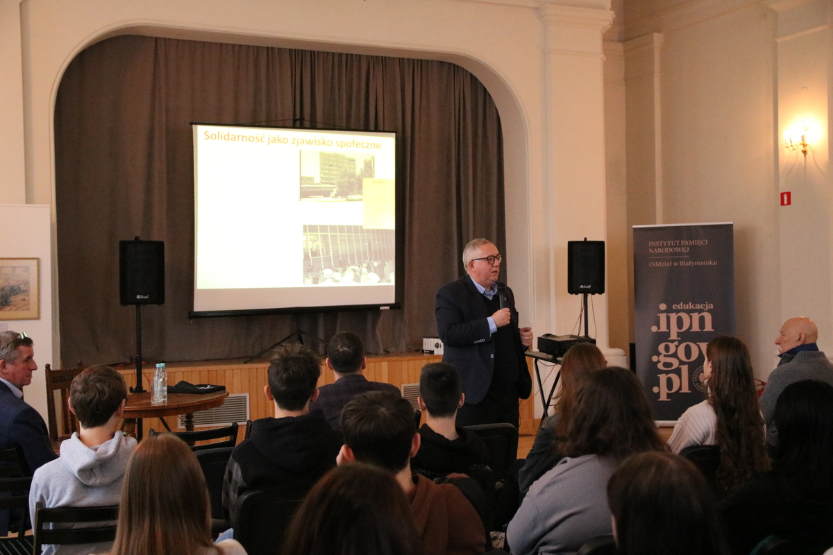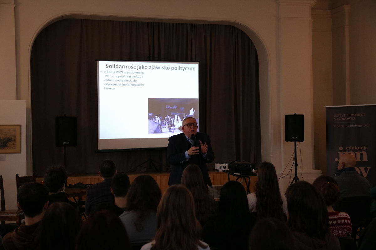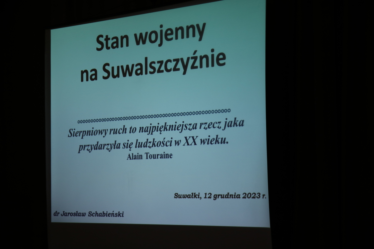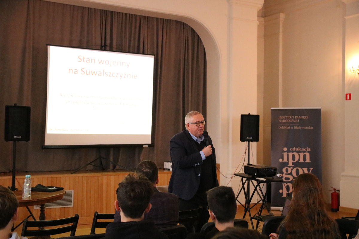 Licznie zgromadzoną młodzież szkolną oraz przedstawicieli suwalskich władz samorządowych i instytucji kultury wprowadził doskonale w temat dr Jarosław Schabieński. W bogatym w nieznane treści wykładzie przedstawił w szczegółach okoliczności i przebieg stanu wojennego na Suwalszczyźnie.