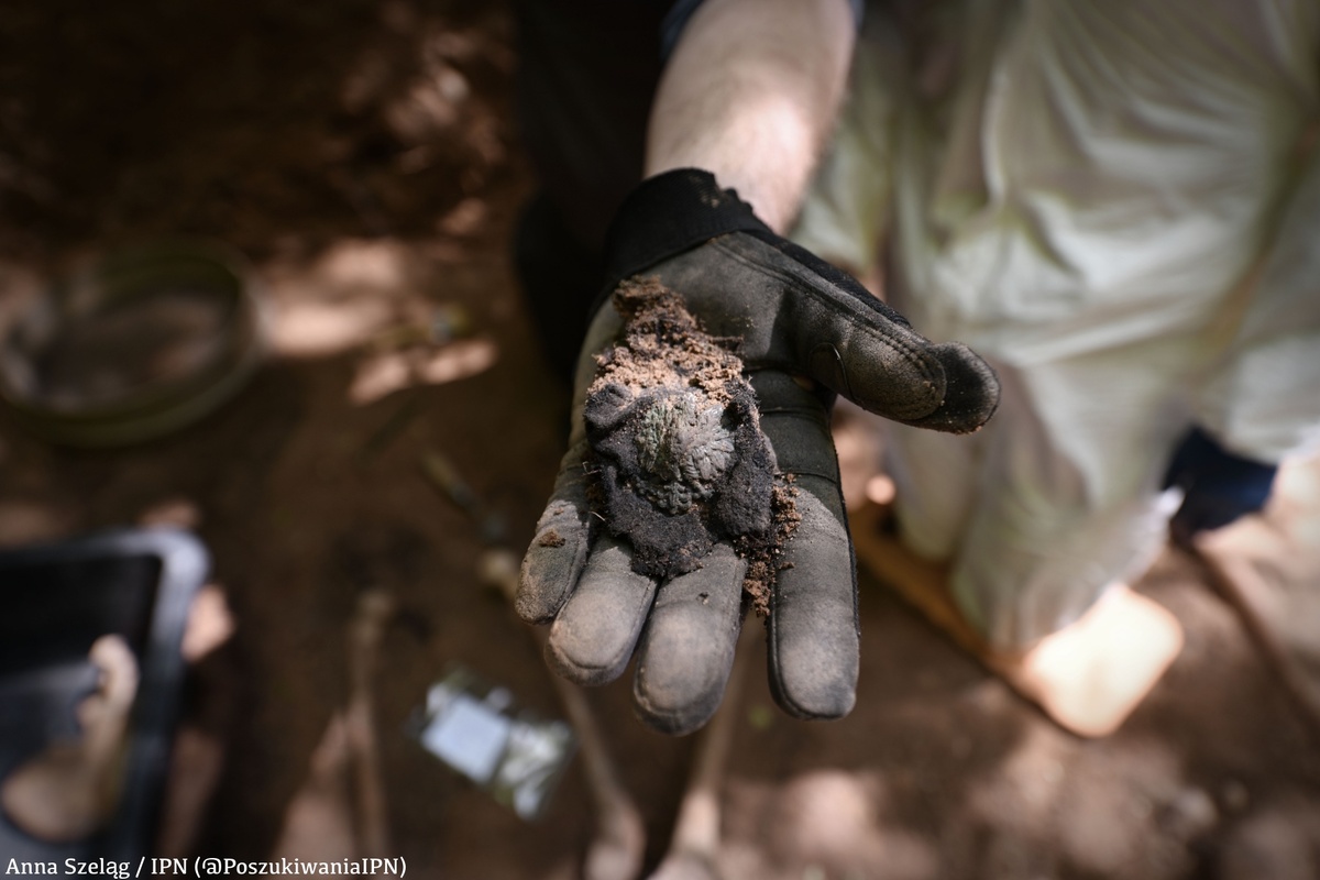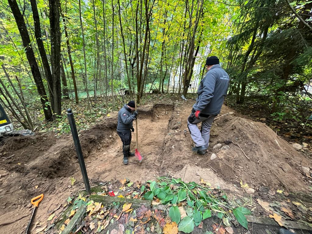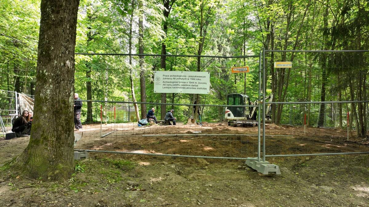 Pierwszy etap prac poszukiwawczych przeprowadzono jeszcze w październiku 2023 r. We współpracy z litewskimi archeologami udało się zlokalizować pierwszą zbiorową mogiłę. Skrywała ona szczątki co najmniej 9 osób. Nie udało się uchwycić obrysu całego grobu, gdyż jama wchodziła pod współczesne upamiętnienie. Większość ujawnionych szkieletów była uszkodzona – to wynik niedbałej, wykonanej przy użyciu koparki, ekshumacji z 1979 r. W jamie grobowej odnaleziono szereg artefaktów, które bezsprzecznie wskazywały, że pochowani to żołnierze Armii Krajowej. Zabezpieczono polskie guziki, przedmioty osobiste, fragmenty umundurowania. W celu przeprowadzenia badań antropologicznych podjęte szczątki zostały przewiezione na Uniwersytet Wileński.