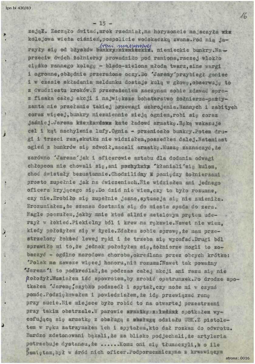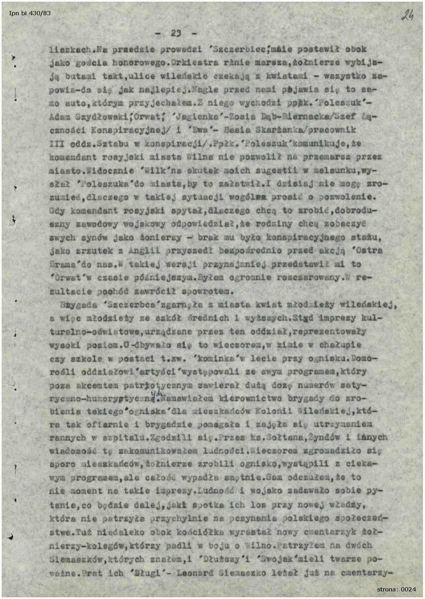 W zaprezentowany Państwu materiałach znajduje się fragment wspomnień Ireny Tyman, ps. „Baśka” (zobacz kopie cyfrowe w galerii: IPN Bi 358/44, s. 16–20). Głównym zadaniem „Baśki” w trakcie operacji „Ostra Brama” było przekazywanie wiadomości i rzeczy między sztabem w Wołkorabiszkach (lt. Varkalabiškės), a Wilnem. Jest to pozbawiona patosu relacja z wykonywanych działań w ramach swoich obowiązków i opis prozy wojny. Wartościowe są wspomnienia przemyśleń łączniczki z tamtego okresu, trzeźwe, choć negatywne spojrzenie na sytuację, przykładowo: