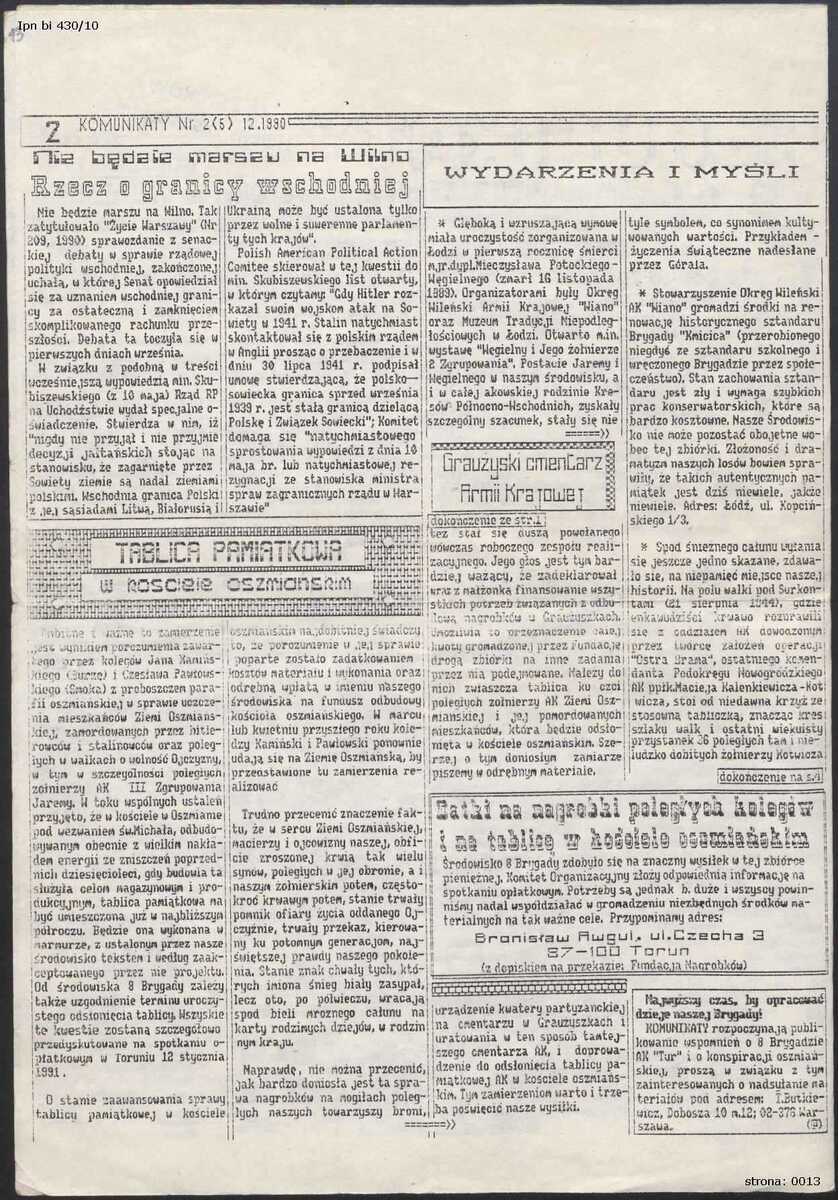 Interesująca jest prasa środowiska wileńskiego AK. Zawiera informacje o ich działalności kombatanckiej, opinie wobec operacji „Ostra Brama”. Autorzy tekstów poruszają aktualne w momencie pisania wyzwania, takie jak ochrona miejsc pamięci, grobów. Próbują wpłynąć na opinię publiczną w celu większego upamiętnienia wileńskich żołnierzy AK. Z tych materiałów wyłania się również atmosfera życzliwości i koleżeństwa wśród dawnych żołnierzy, wspólnego wspierania się, szczególnie chwytająca za serce jest ich pamięć o swoich zmarłych koleżankach i kolegach. Zobacz kopie cyfrowe w galerii: IPN Bi 430/10, s. 12–13, 49.