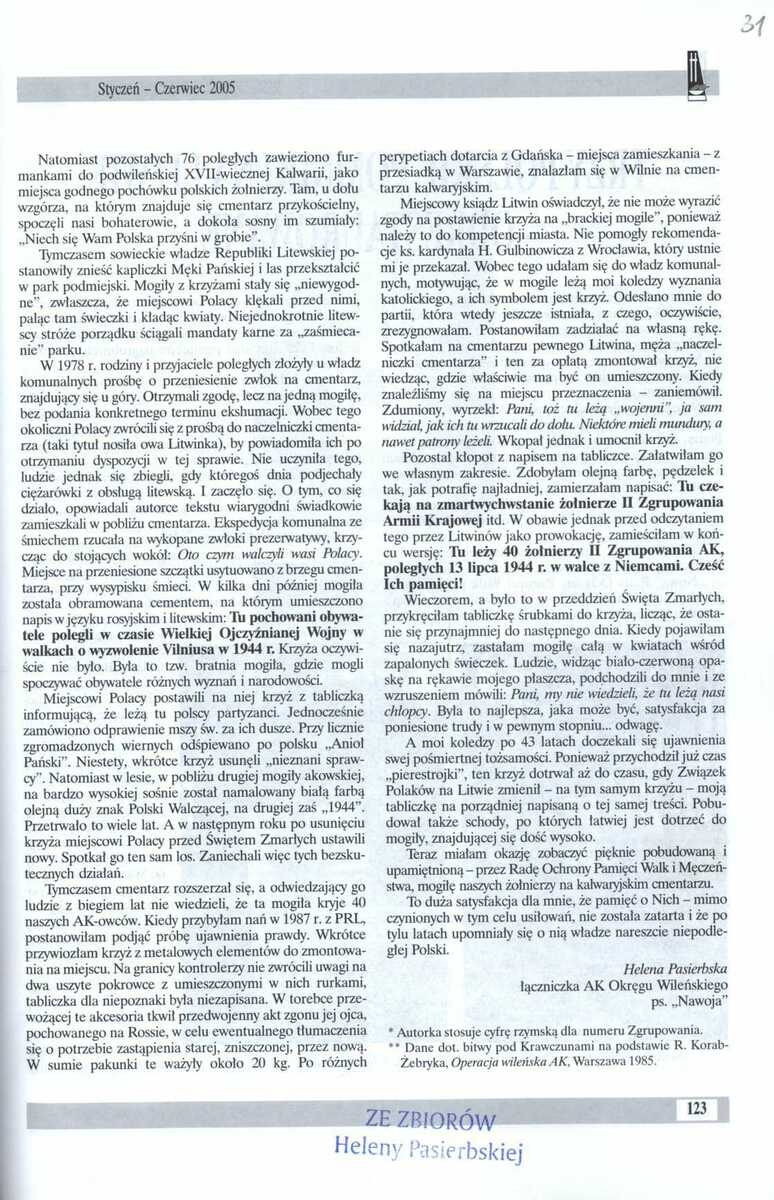 Również Pani Helena Pasierbska wykazała się dużą wytrwałością aby upamiętnić poległych żołnierzy AK. Dzięki jej staraniom na cmentarzu w Kalwarii wileńskiej Rada Ochrony Pamięci i Walk Męczeństwa wybudowała mogiłę upamiętniającą żołnierzy II Zgrupowania AK. Zobacz kopie cyfrowe w galerii: IPN Bi 430/26, s. 2, 9, 30–31.