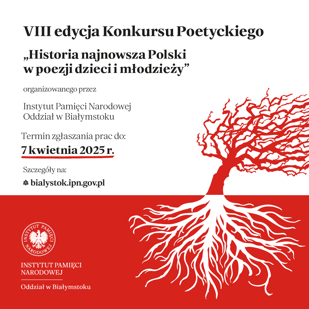 Drodzy Konkursowicze! Z wielką przyjemnością pragniemy ogłosić wyniki VIII edycji konkursu poetyckiego ,,Historia najnowsza Polski w poezji dzieci i młodzieży” organizowanego przez Oddziałowe Archiwum Instytutu Pamięci Narodowej w Białymstoku przy wsparciu Delegatury IPN w Olsztynie. W odpowiedzi na nasze zaproszenie wpłynęło 113 prac z województwa podlaskiego i warmińsko-mazurskiego, które jak co roku zaskoczyły nas swoją wrażliwością i dojrzałością. Przypominamy, że zadaniem uczestników konkursu było przygotowanie własnego utworu poetyckiego, który powinien odnosić się do wartości patriotycznych lub upamiętniać wydarzenie, miejsce, osobę, symbol itp. z najnowszej historii Polski z lat 1918-1989 na podstawie dowolnie wybranego źródła historycznego, które stało się inspiracją do powstania utworu.