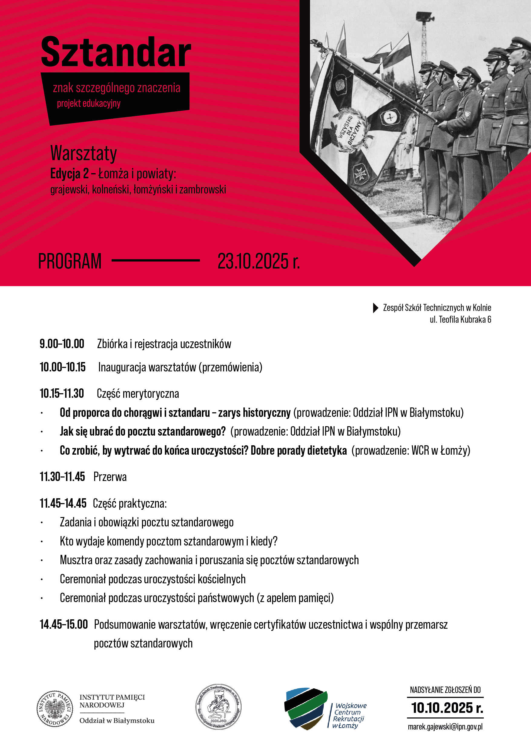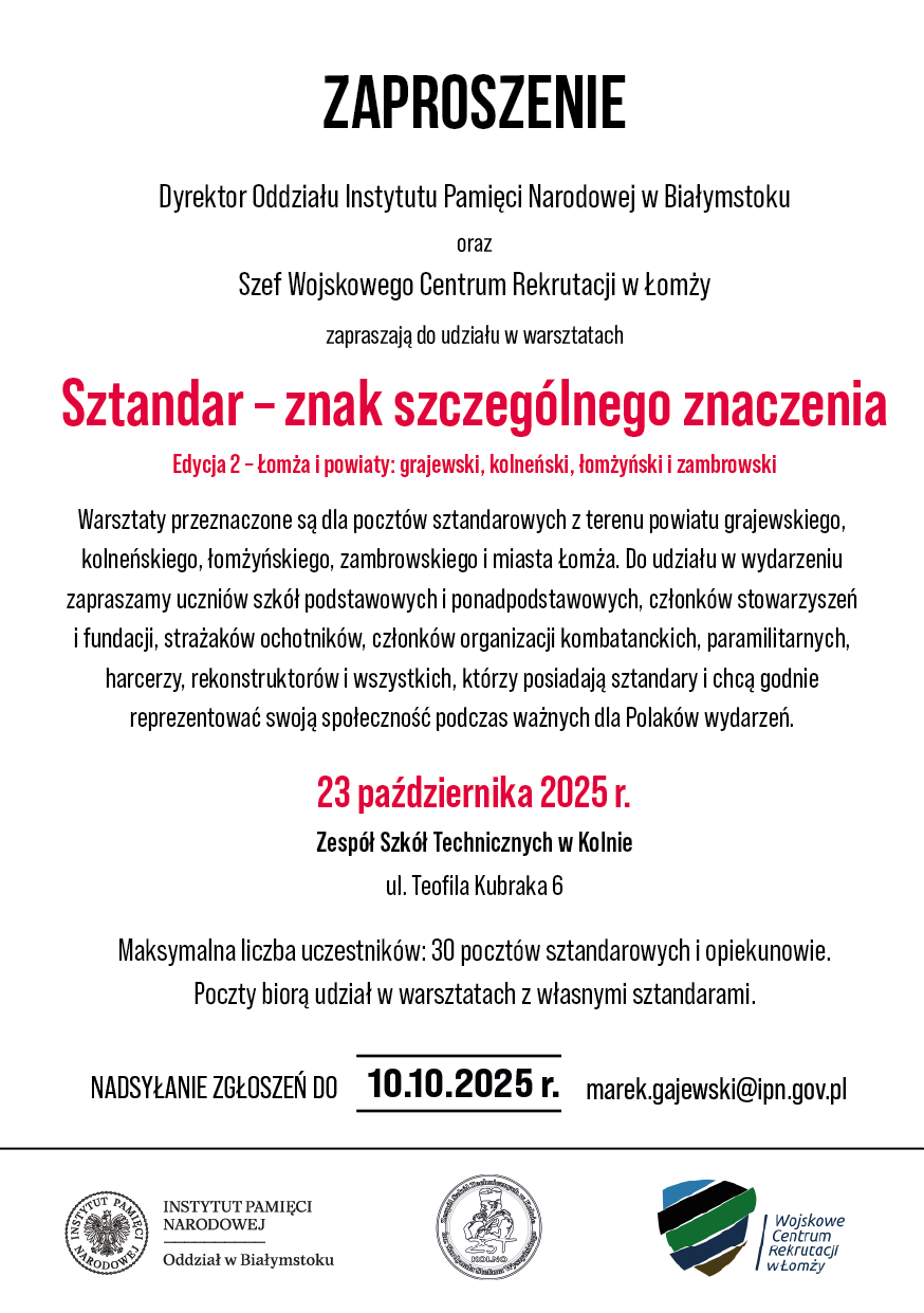 Do udziału w warsztatach szkoleniowych zapraszamy uczniów szkól podstawowych i ponadpodstawowych, członków stowarzyszeń i fundacji, strażaków ochotników, członków organizacji kombatanckich, harcerzy, rekonstruktorów i wszystkich tych, którzy posiadają sztandary i chcą godnie reprezentować swoją społeczność podczas ważnych dla Polaków wydarzeń. Odbędą się one w czwartek 23 października 2025 r., w Zespole Szkół Technicznych w Kolnie przy ul. Teofila Kubraka 6, w godzinach od 9.30 do 15.00.