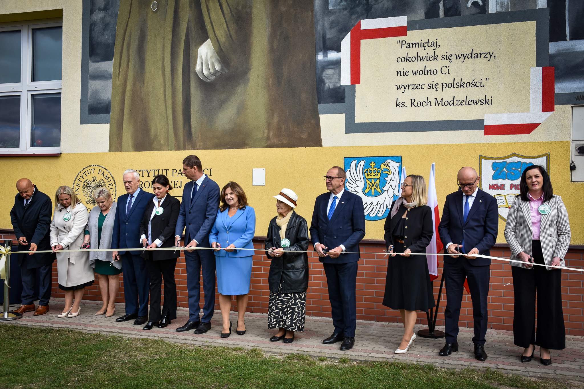 Przecięcia wstęgi dokonali: Bożena Jadacka-Jóźków - krewna ks. Rocha Modzelewskiego, Poseł na Sejm Rzeczypospolitej Polskiej Dariusz Piontkowski, Poseł na Sejm Rzeczypospolitej Polskiej Jacek Bogucki, Senator Rzeczypospolitej Polskiej Anna Bogucka, Starosta Powiatu Wysokomazowieckiego Bogdan Zieliński, Zastępca Wójta Gminy Nowe Piekuty Ewa Pruszyńska, Monika Baczar, naczelnik Oddziałowego Biura Upamiętniania Walk i Męczeństwa, Dyrektor Zespołu Szkolno-Przedszkolnego w Nowych Piekutach Marzena, Olędzka, Przewodnicząca Rady Rodziców Przedszkola Wesoły Promyk Sylwia Radulska, Przewodnicząca Rady Rodziców Szkoły Podstawowej w Nowych Piekutach Emilia Piekutowska oraz Zbigniew Zalewski, dyrektor szkoły, który doprowadził do nadania imienia placówce oraz Tadeusz Wojtkowski, przewodniczący Rady Rodziców w czasie, gdy trwała procedura wyboru patrona szkoły.