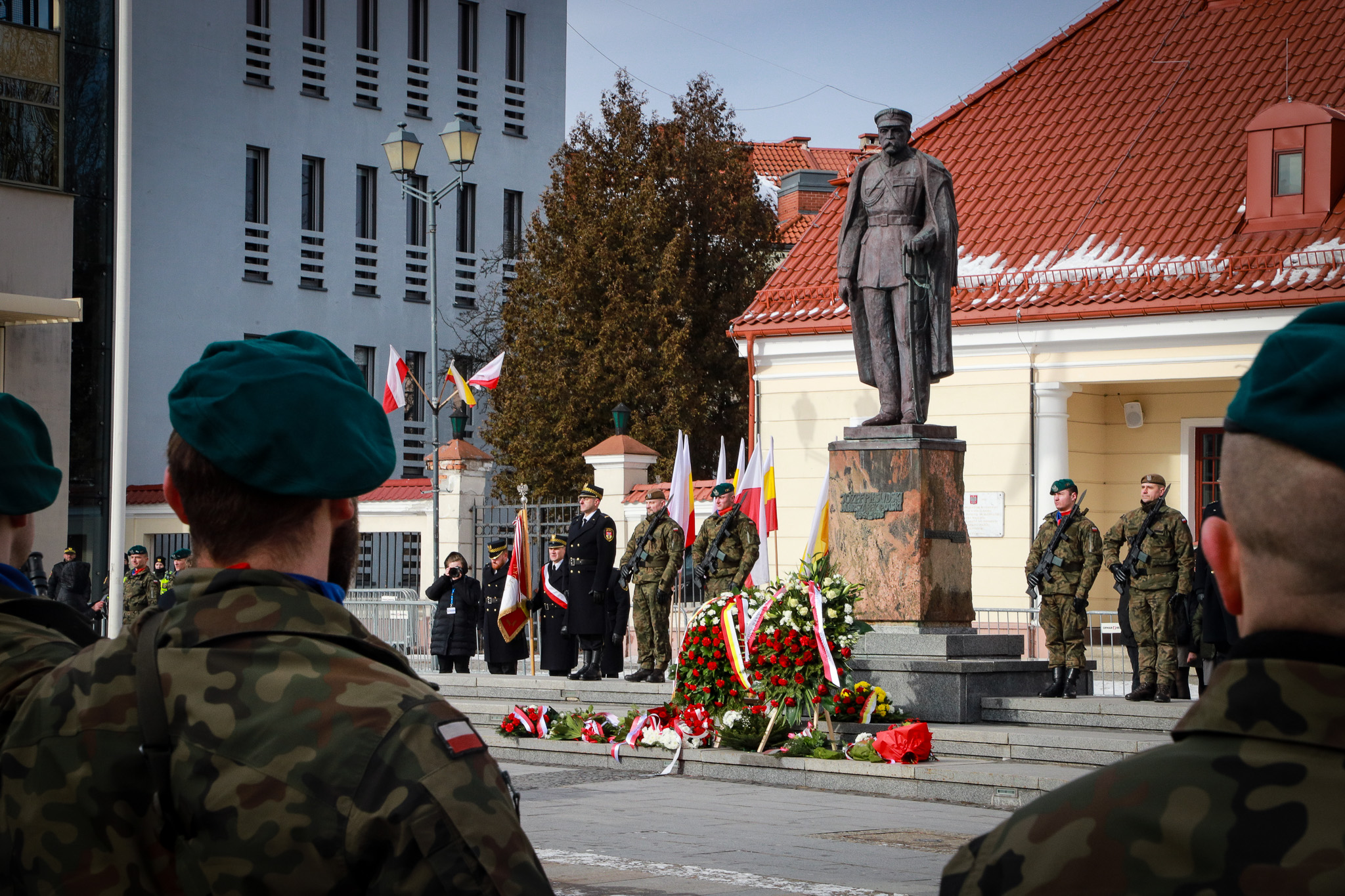 Na maszt – przy dźwiękach „Mazurka Dąbrowskiego” – wciągnięto biało-czerwoną flagę, oddając hołd tym, którzy walczyli o wolność naszej Ojczyzny. Przed pomnikiem Marszałka Piłsudskiego złożono wieńce i zapalono znicze jako wyraz pamięci i wdzięczności.