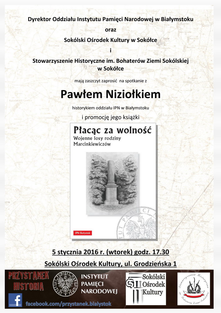 Dyrektor Oddziału Instytutu Pamięci Narodowej w Białymstoku, Sokólski Ośrodek Kultury w Sokółce oraz Stowarzyszenie Historyczne im. Bohaterów Ziemi Sokólskiej w Sokółce zapraszają na spotkanie z Pawłem Niziołkiem, historykiem z Oddziałowego Biura Edukacji Publicznej białostockiego oddziału Instytutu, autorem książki „Płacąc za wolność. Wojenne dzieje rodziny Marcinkiewiczów”. Spotkanie odbędzie się w dniu 5 stycznia 2016 r., o godz. 17.30, w siedzibie Sokólskiego Ośrodka Kultury przy ul. Grodzieńskiej 1. Serdecznie zapraszamy. Wstęp wolny.