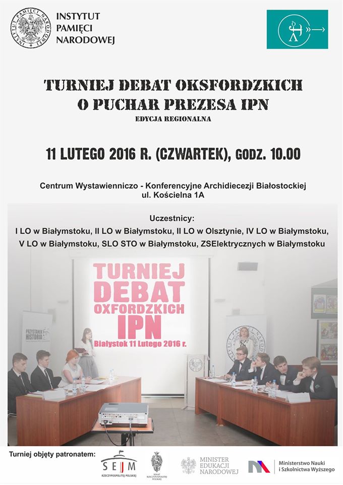 11 lutego 2016 r., o godz. 10:00, w Centrum Konferencyjno-Wystawienniczym Archidiecezji Białostockiej (ul. Kościelna 1A) odbędzie się Turniej Debat Oksfordzkich o Puchar Prezesa IPN (edycja regionalna). Wezmą w nim udział ekipy z I, II, IV i V LO w Białymstoku oraz z SLO STO i ZSE w Białymstoku, a także z II LO w Olsztynie.