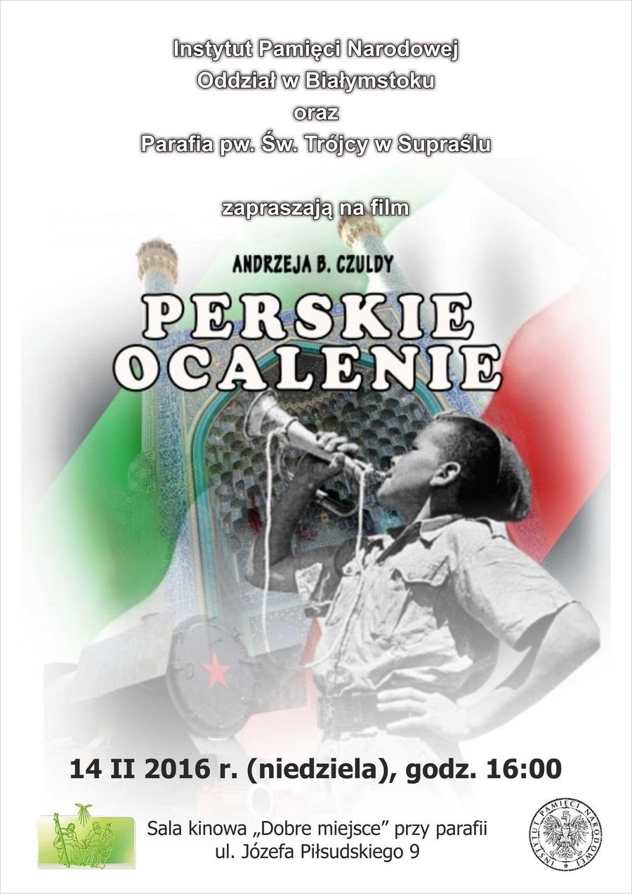 W dniu 14 lutego 2016 r., o godz. 16.00, w sali kinowej „Dobre miejsce” przy parafii św. Trójcy w Supraślu (ul. Józefa Piłsudskiego 9) odbędzie się projekcja filmu dokumentalnego „Perskie ocalenie” (reż. A. B. Czulda, 2013 r.) opowiadającego o losach polskich dzieci ewakuowanych w czasie II wojny światowej z ZSRS do Persji. Film poprzedzi prelekcja dr. Ewy Rogalewskiej z Oddziałowego Biura Edukacji Publicznej IPN w Białymstoku.