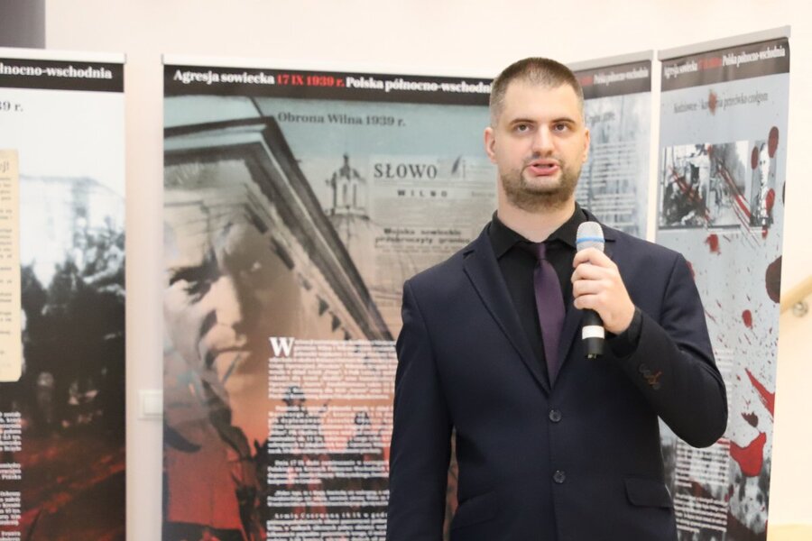 Historyk z OBEN IPN w Białymstoku Waldemar Tyszuk opowiedział o przygotowanej przez siebie wystawie „Agresja sowiecka 17 września 1939 r. Polska północno-wschodnia”, posiłkując się przy tym dobrze przyjętą przez zgromadzoną młodzież prezentacją multimedialną.