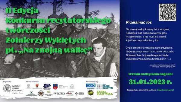 26/11/2022KonkursPrzedłużamy termin nadsyłania prac do 3 lutego 2023 roku - II edycja konkursu recytatorskiego twórczości Żołnierzy Wyklętych pt. „Na znojną walkę”