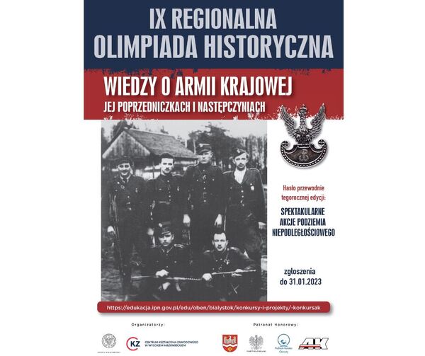 24/11/2022KonkursTo już ostatnia szansa na wzięcie udziału w IX Regionalnej Olimpiadzie Historycznej Wiedzy o Armii Krajowej, jej poprzedniczkach i następczyniach
