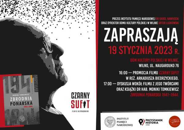 11/01/2023ZaproszenieZaproszenie na promocję filmu "Czarny sufit" oraz dyskusję wokół publikacji "Zbrodnia ponarska 1941–1944" - Wilno, 19 stycznia 2023