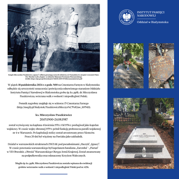 16/10/2024Uroczystość oznaczenia i poświęcenia odnowionego staraniem Oddziału Instytutu Pamięci Narodowej w Białymstoku grobu śp. ks. ppłk. dr. Mieczysława Paszkiewicza, weterana walk o wolność i niepodległość Polski – 18 października 2024