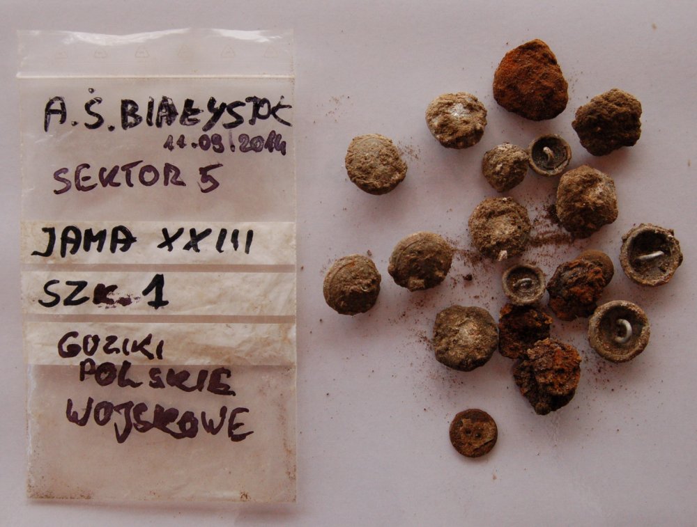 W trakcie dzisiejszych prac ekshumacyjnych na terenie Aresztu Śledczego w Białymstoku z jednej z jam grobowych wydobyto szczątki czworga dzieci. Z kolejnej jamy wyjęto szczątki osoby dorosłej oraz dziecka. Podczas oględzin szczątków mężczyzny, którego szkielet i fragmenty czaszki znaleziono w dniu wczorajszym, antropolodzy natrafili na pocisk kalibru 7,62 mm od broni systemu Tokariew. Przy szczątkach tych odnaleziono wczoraj liczne guziki z orłem bez korony. Archeolodzy zlokalizowali kolejne trzy jamy grobowe, które będą w najbliższym czasie eksplorowane. W sobotę na posesji będą wycinane drzewa rosnące w pasie, w którym znajdują się groby. Od początku prac wydobyto już szczątki 27 osób: kobiet, mężczyzn i dzieci. Prace potrwają jeszcze dwa tygodnie.