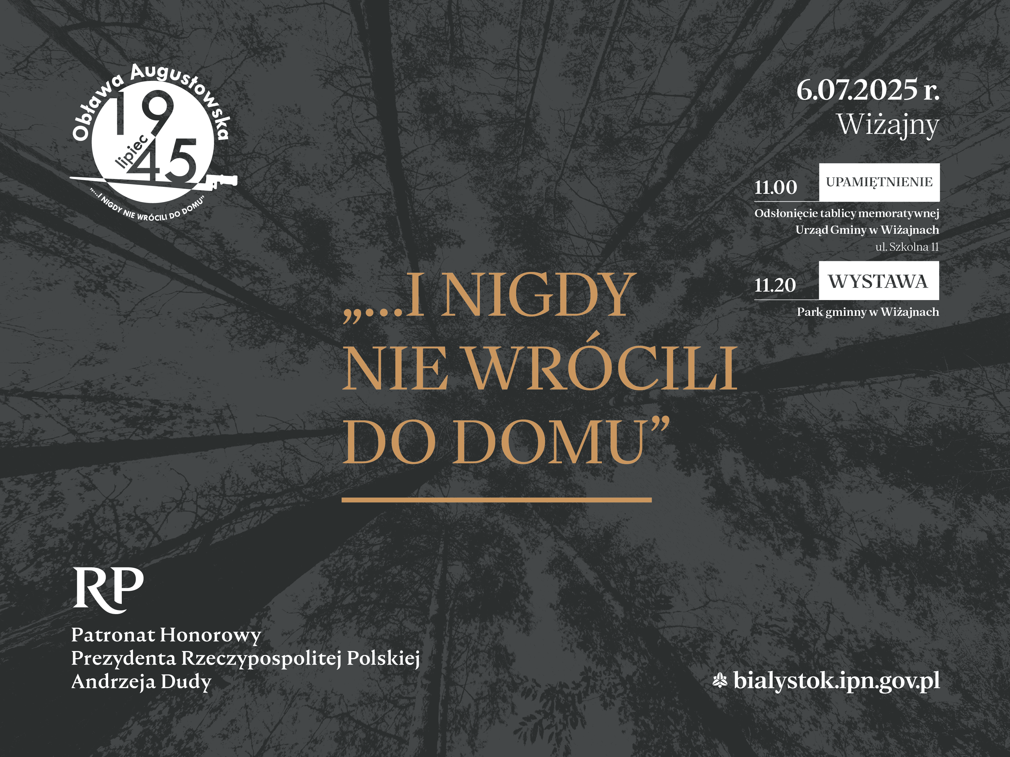 - 11.20 Otwarcie wystawy „...i nigdy nie wrócili do domu. Alfabet Obławy Augustowskiej” autorstwa Jarosława Wasilewskiego - Park gminny w Wiżajnach